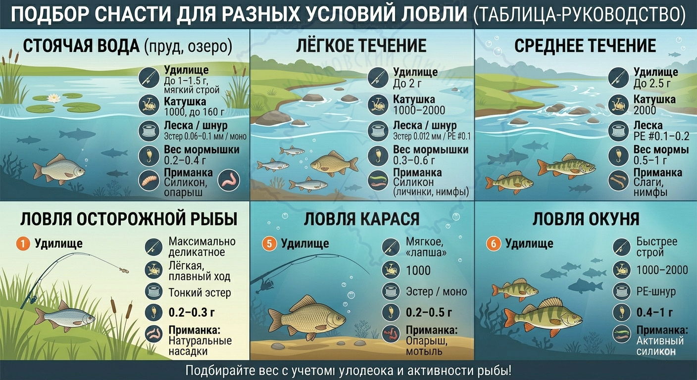 • Удилище: тест до 1–1.5 г, мягкий строй