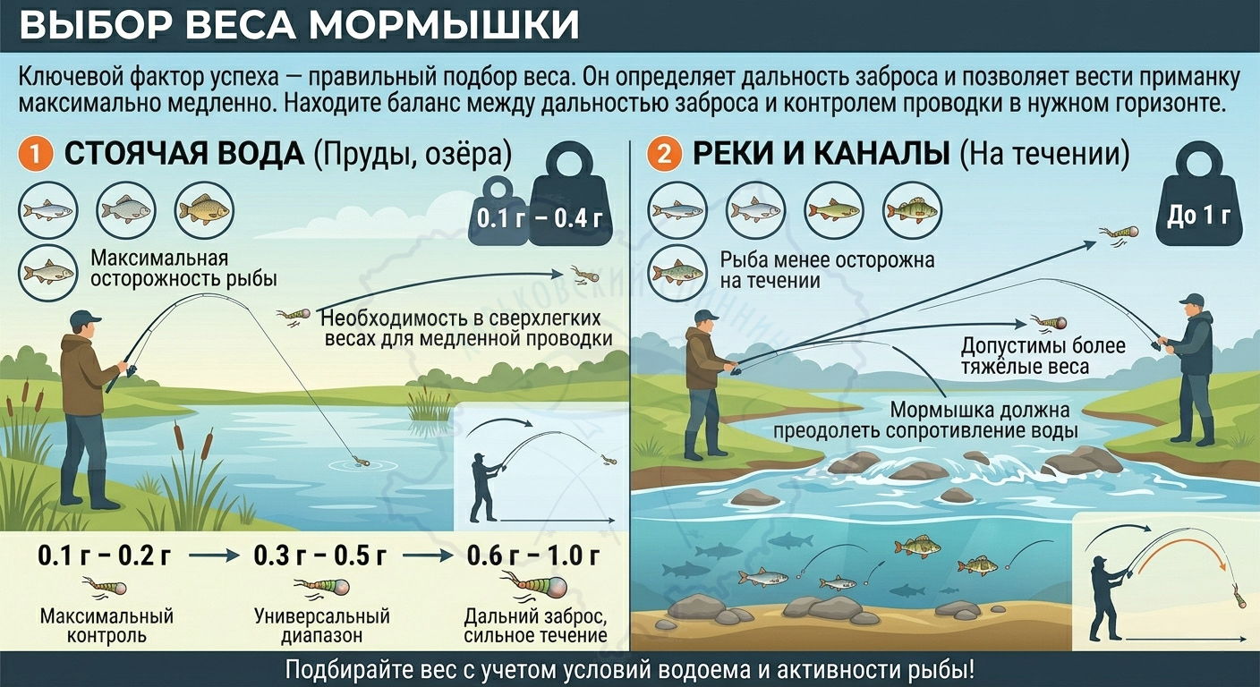 Оптимальный диапазон — 0.2–0.4 грамма для стоячей воды и 0.3–0.6 грамма для лёгкого течения. Вес 0.1 г требует опыта и не подходит для старта.