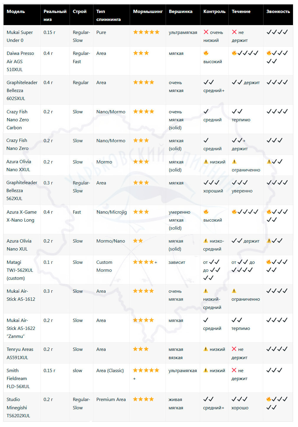 | Модель | Реальный низ | Строй | Тип спиннинга | Мормышинг | Вершинка | Контроль | Течение | Звонкость |