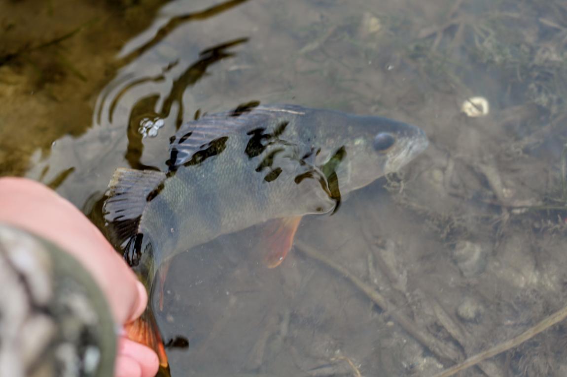 Еще несколько забросов, как с другого края, этой же точки, жадно атакует окунь, засунув рака SL-Remix полностью в морду.